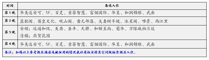 4. 贵州酒店标准偏低,请旅游者提前做好心理准备。如遇旺季酒店资源紧张或政府临时征用等特殊情况,我社有权调整为同等级标准酒店。