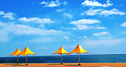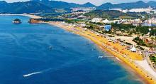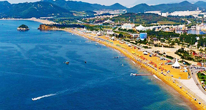 【十里黄金海岸】黄金海岸绵延4.5公里,宽100-200米,北方最大,滩上细砂匀布,避风朝阳,平缓洁净,海水清澈,波高适宜,弓形滩面被两侧突入海面的岬角抱住,地理环境得天独厚。
