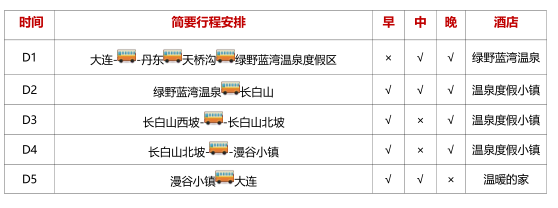早上7:00香炉礁汤本汤温泉侧身停车场集合出发,开启东北秘境山水、休闲温泉之旅。 鸭绿江公园:边陲小镇鸭绿江,位于中国丹东市,与朝鲜隔江相望,断桥、江水,令人流连往返。 天桥沟森林公园:此地曾为清王朝时的“龙兴之地”所以几百年来一直没有被破坏,山上森林密布,大 树古木 众多,山间还有清澈的山泉溪流,环境非常优美。这里地貌独特,山上有很多的奇峰怪石,造型各异, 可以一 一观赏游玩。而每到秋天,漫山枫叶遍布,更是观赏和拍摄红叶的最佳地点。 绿野蓝湾温泉度假酒店:设计及建筑风格独特,景区内有热带雨林式温泉嬉水乐园。浅水区小品池,中型玛雅水 寨、大型造浪池、彩红竞赛滑梯,冲天回旋皮筏滑梯、雪橇滑梯、炮筒滑梯等众多水上游乐项目。温泉馆,拥有 来自南方的花草树木百余种,内部是自然采光,热带植物……俨然一幅热带雨林的景象。游泳馆、各类泡池 18 个,温泉鱼疗池,SPA 池、花药浴、五行池等,大型环廊亭阁于绿意掩映下景致迷人,大型汗蒸区分布多种功 效房、玉石房、玛瑙房、蒙古包、玉石子浴等