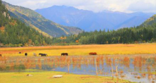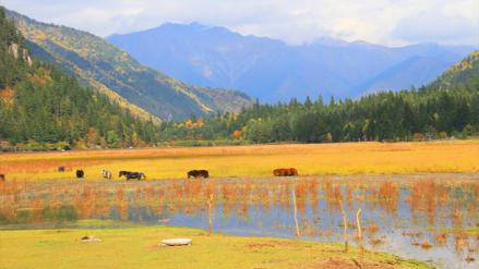 甘海子学名芳草海,这里原是一处高山湖泊,后因地质变化,出水口扩大,所以当地百姓俗称“干海子”。其实,“干海子”并不干,这里四周远山层叠,森林茂密,海子中溪水蜿蜒,芳草萋萋,如天鹅绒地毯铺满大地,夏秋季野花点缀其间,牛羊骡马成群,冬春时则一片深黄,与周围的雪山红叶相映成趣。