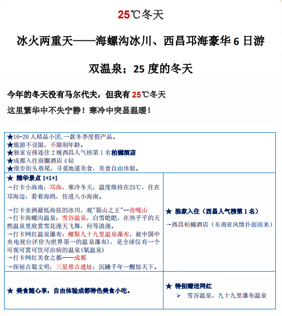 赠送项目: 赠送双温泉:螺髻山九十九里温泉瀑布;海螺沟温泉(自备泳衣)