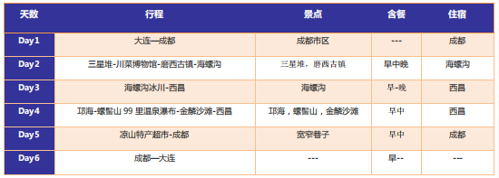 大连周水子机场 6 号门集合出发前成都,专业人员送站;怀着愉快轻松的心情前往“天府之国” ——成都,成都简称蓉,别称蓉城,锦城,四川省省会。成都是国家历史文化名城,古蜀文明发祥 地,中国十大古都之一。一起享受接下来的旅行吧……